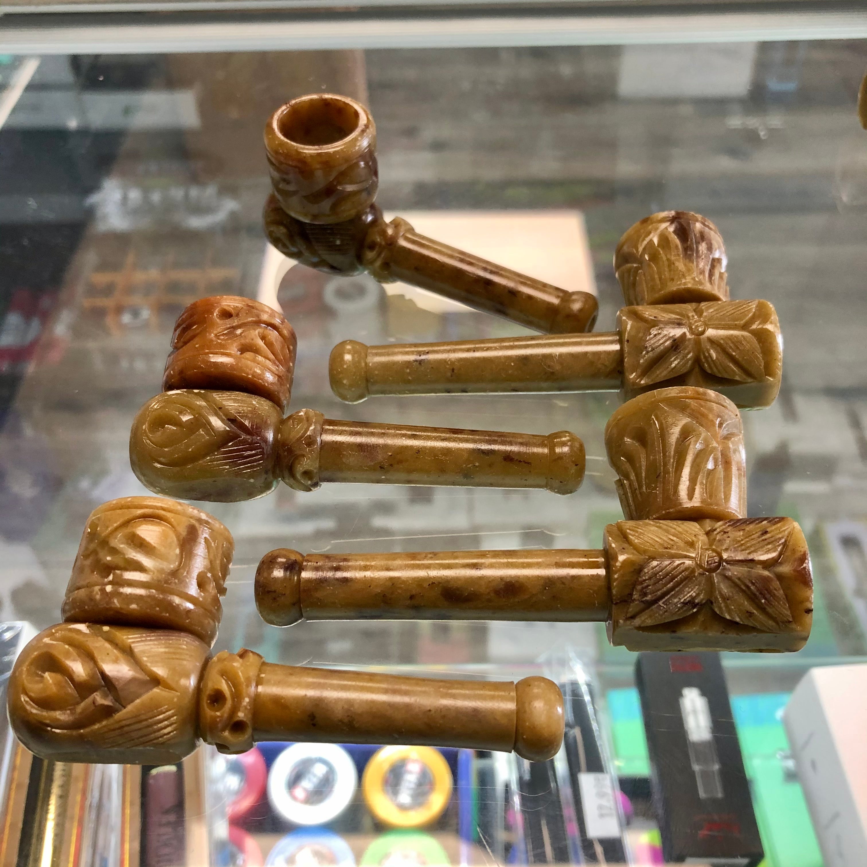 These chimney-style, marble stone pipes features a variety of cuts, shapes, colors, and unique carved design. Stone pipes eliminate a large amount of heat transference from the bowl, and these pocket-sized pipes are perfect for on the go! Pipes measure 3.4 inches to 3.6 inches long.