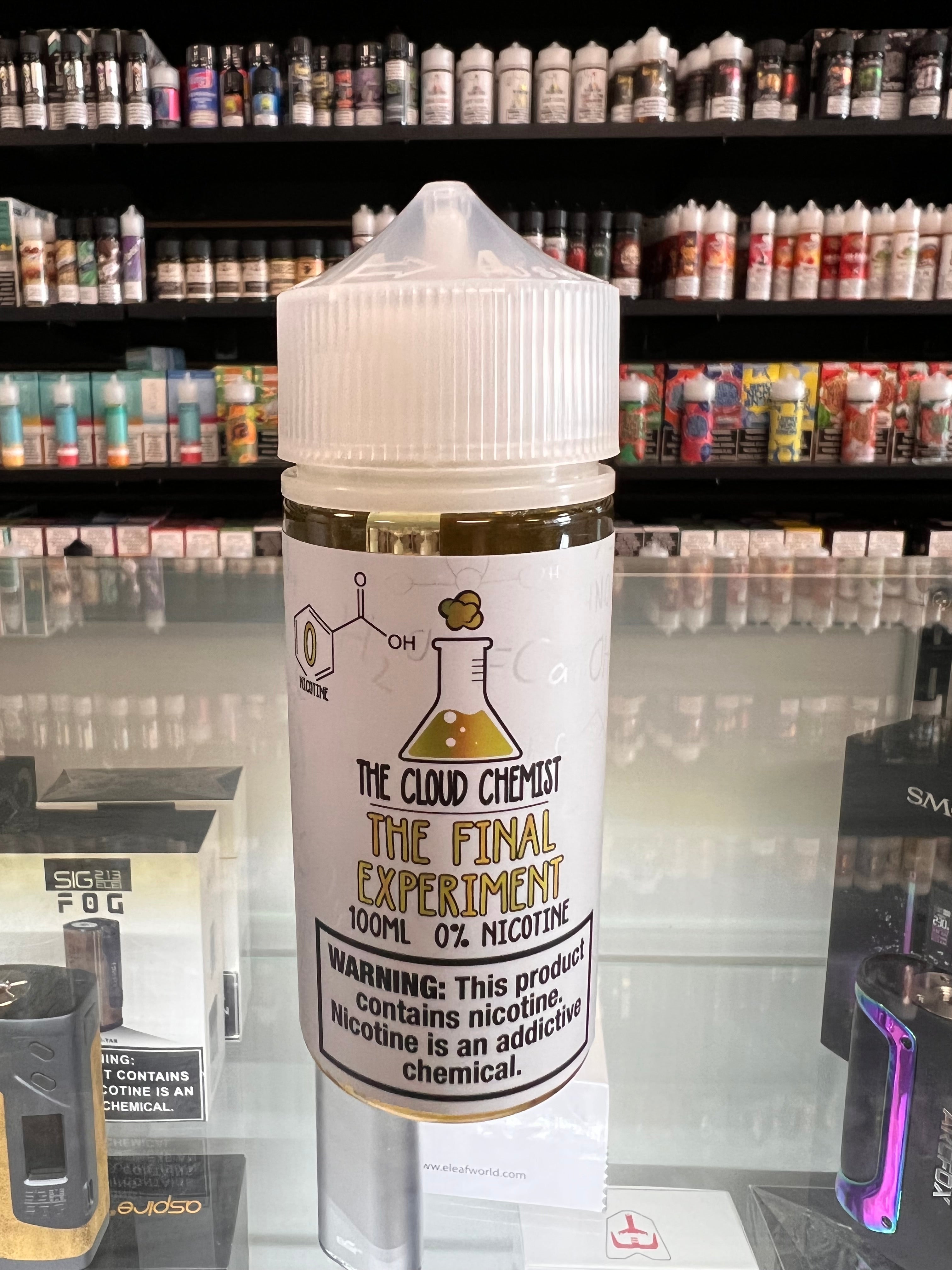 The Cloud Chemist - The Final Experiment (100ml) The Final Experiment in the Cloud Chemist's laboratory has a nostalgic sweet frosted corn cereal inhale, with a maple brown sugar drizzle and a creamy finish. Flavor Profile: Sweet Frosted Corn Cereal, Maple Brown Sugar, Milk Nic Level: 3mg, 6mg VG/PG: 70/30 Bottle Size: 100ml